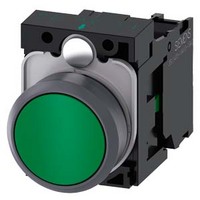 Przycisk podświetlany Siemens; Z samopowrotem; Materiał obudowy: plastikowo-metalowy; Płaski; Średnica: fi22mm; Napięcie znamionowe: 110V AC; kolor: zielony; 1NO; zaciski śrubowe
