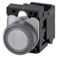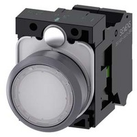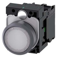Przycisk podświetlany Siemens; Z samopowrotem; Materiał obudowy: plastikowo-metalowy; Płaski; Średnica: fi22mm; Napięcie znamionowe: 24V AC/DC; kolor: biały; 1NO; zaciski śrubowe